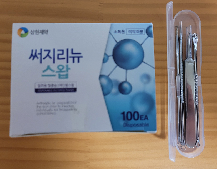 여드름 압축기를 사니까 왼쪽의 알콜스왑을 100개 사은품으로 끼워줬다.