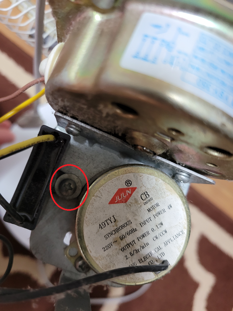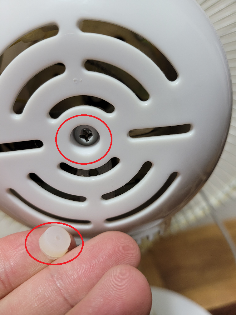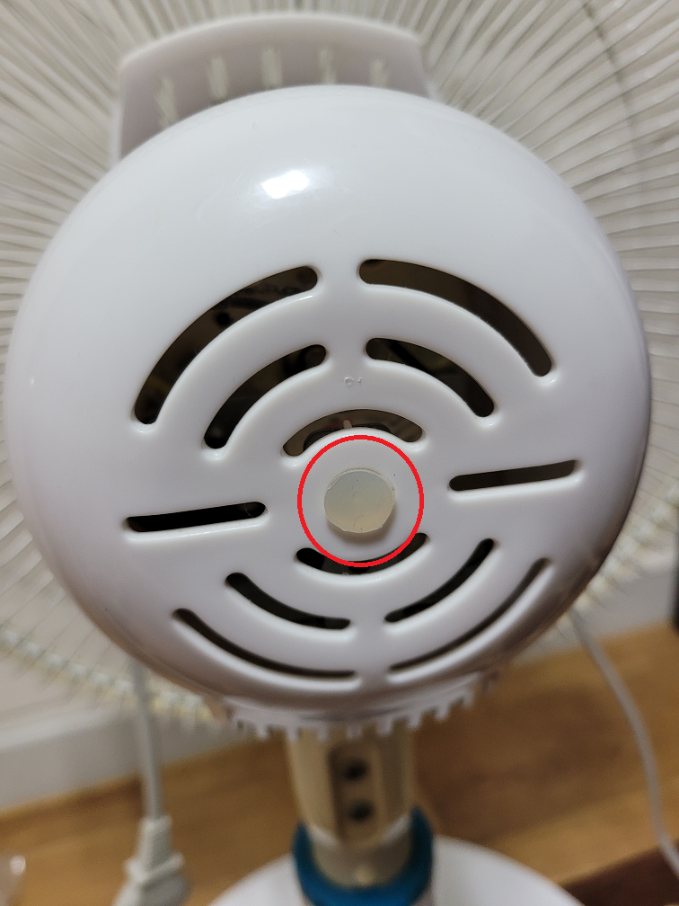선풍기 모터 부분의 뒤쪽을 보면, 위의 빨간 부분과 같이 고무재질의 부분이 있는데 손가락으로 톡톡 빼보면 나사가 하나 나온다.
