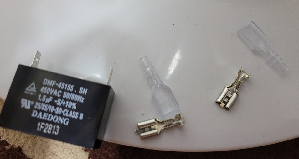 이렇게 컨덴서 하나, 그리고 전선을 컨덴서에 연결하기 위해 납땜을 할수도 있지만 고장나면 또 교체해야 되므로, 250 단자와 커버도 같이 구입했다. 250 단자는 커버와 단자 1개 세트로 해서 100원이고, 2세트이므로 200원이면 살수 있다.