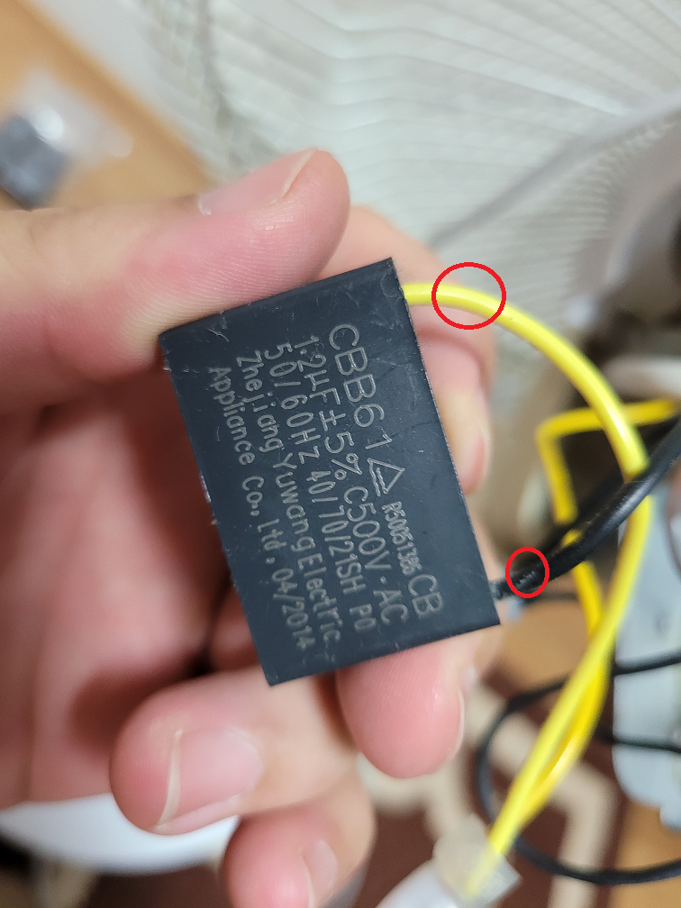 뭐가 문제인지 몰라서 일단 이번 여름에는 버텨야 하니 선풍기를 두개를 일단 사서 사용했는데, 대체 무엇이 문제인지 참 답답한 마음에 검색을 해보니, 선풍기 모터를 움직이게 하는데 처음에 큰 힘이 필요한데 이때 사용되는 콘덴서(모터 기동 컨덴서)가 고장이 생기면 이런 증상이 생긴다는 것을 알게 되어 바로 선풍기를 뜯어보고 호환되는 제품으로 구입해서 고쳤다.